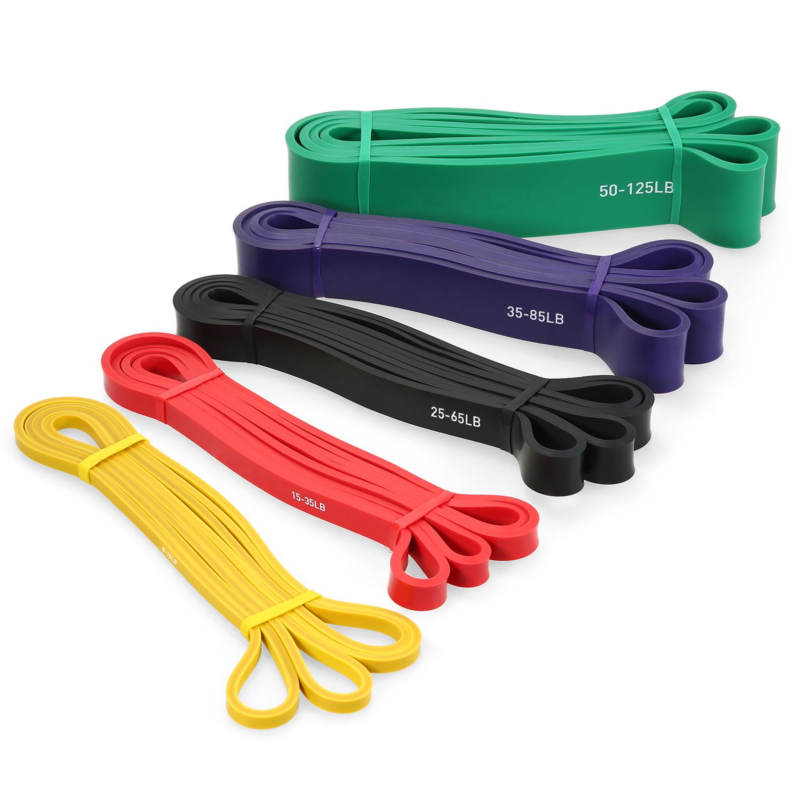 Each band with different colors and clearly marked with tension range: Yellow 8-15LBS, Red 15-30LBS, Black 25-65LBS, Purple 35-85LBS.