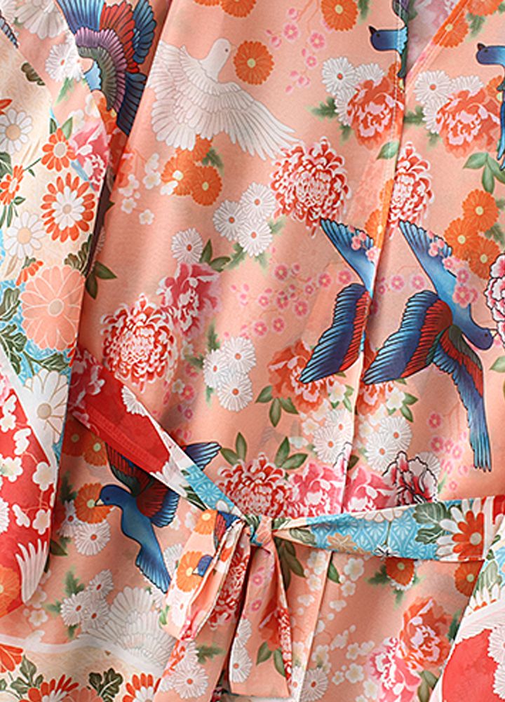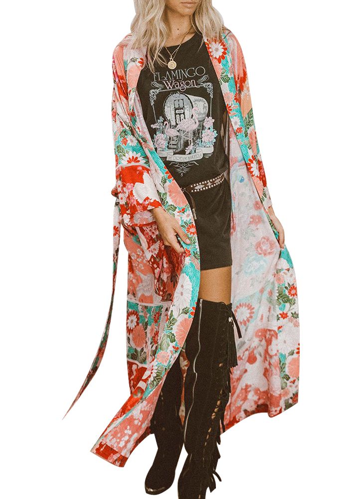 This maxi kimono-style cardigan features colorful floral print all over, dropped shoulder with batwing long sleeves, open placket and a matching waist strap. Finished with silky chiffon fabric and a comfy loose fit.