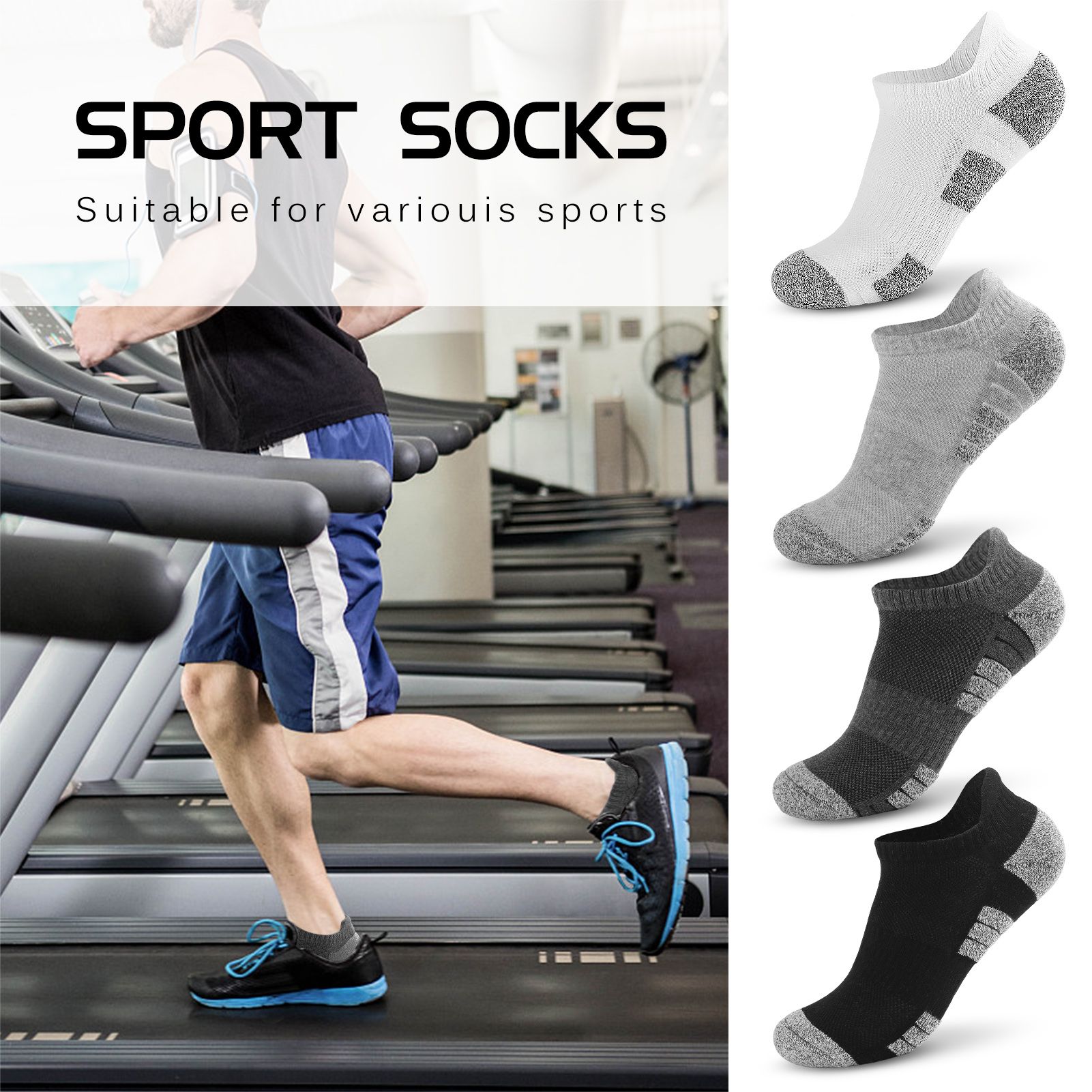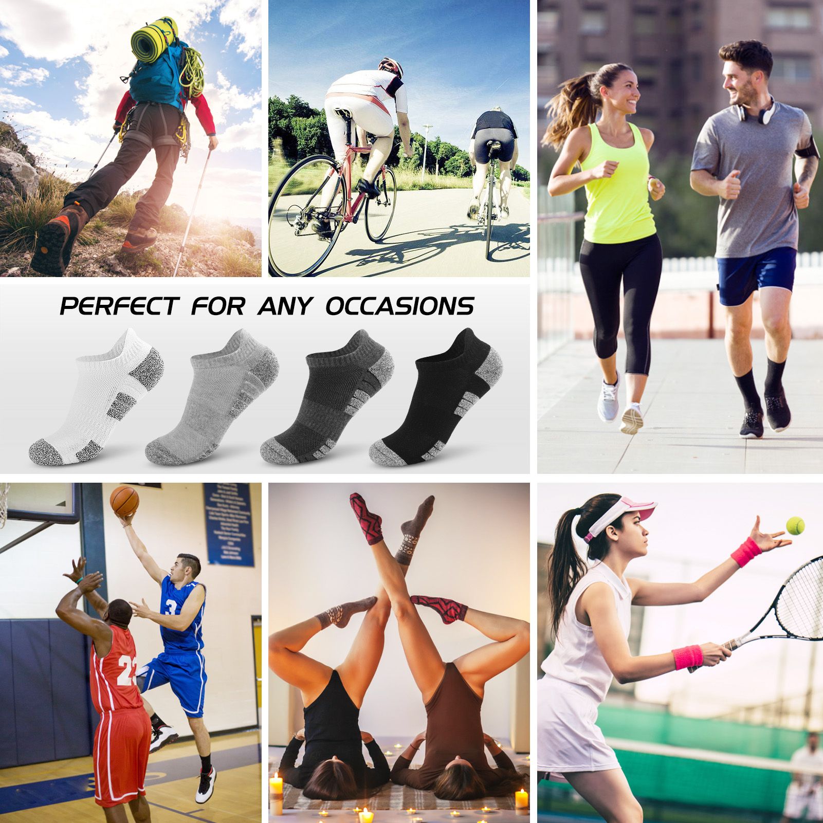 This socks are made from 80% cotton, 17% polyester and 3% spandex, soft, breathable, good air-permeability and moisture wicking performance, keeping your feet dry all day long. Great choice for outdoor activities like running, cycling, mountaineering, hiking ,tennis, gym sessions, walking ,trips, golf, jogging and daily use.