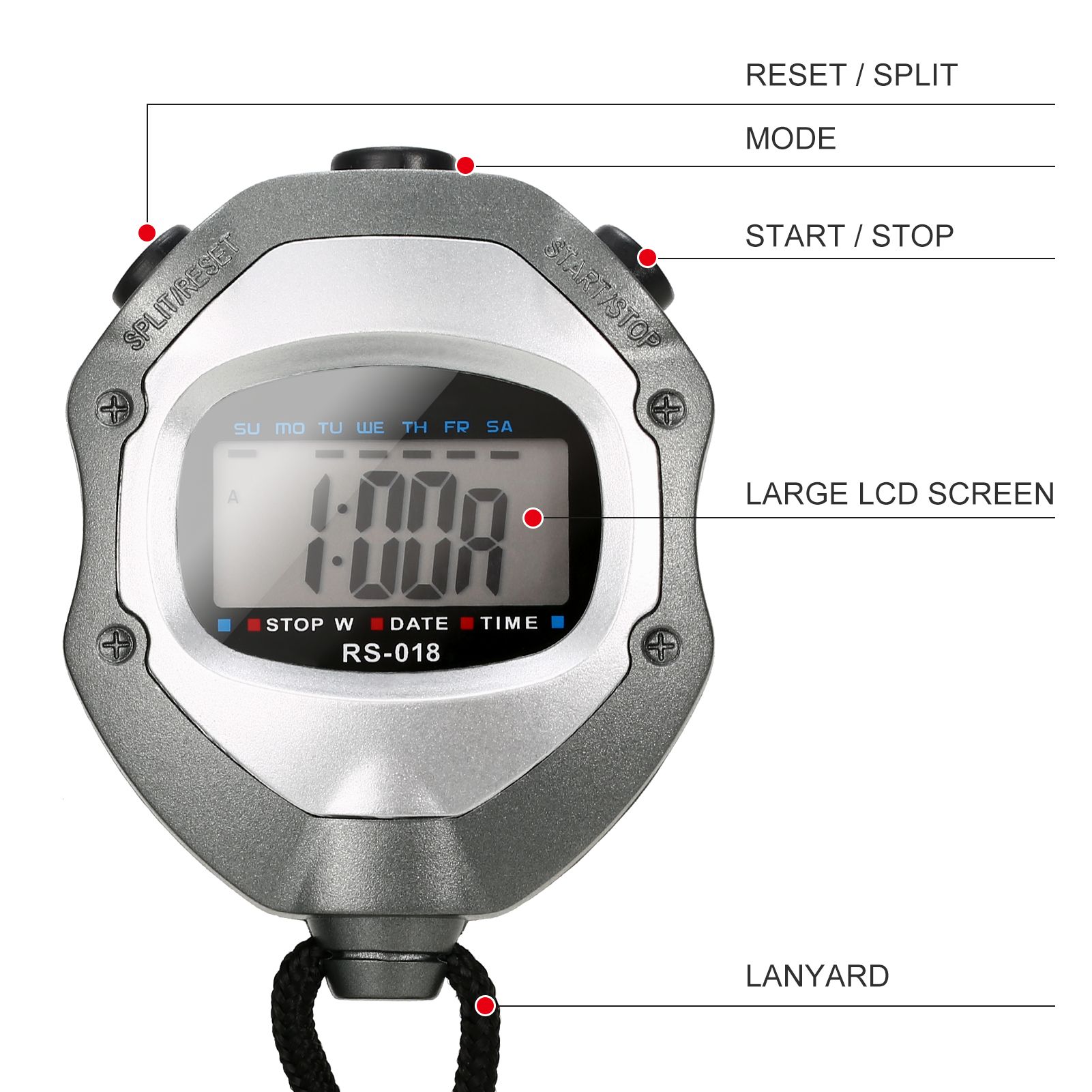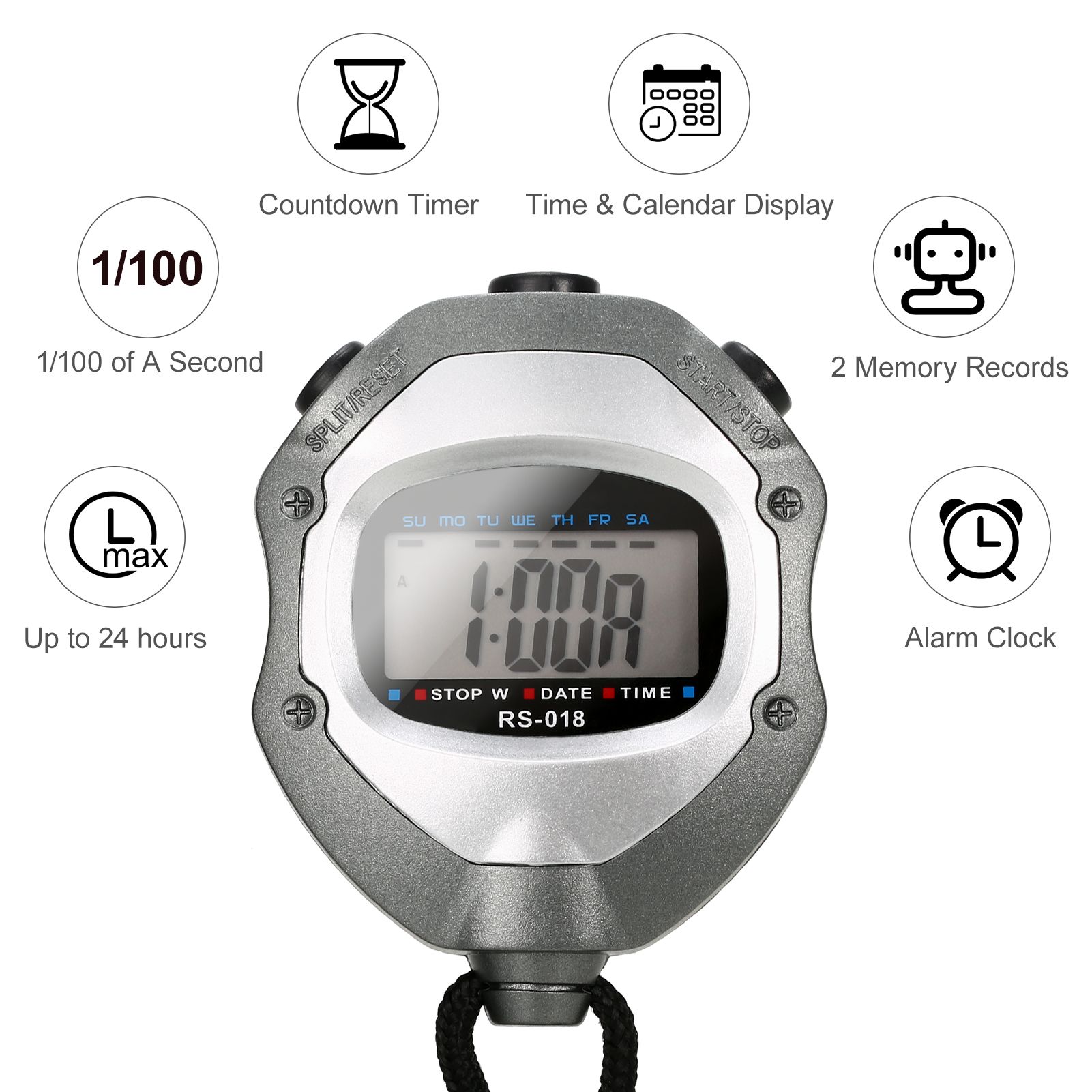 The stopwatch can display calendar, clock, hour, minute, second, week, month, day, selectable 12/24 hour.